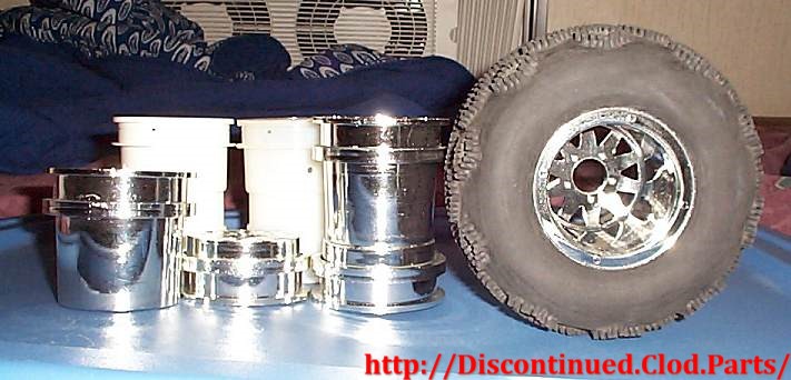 Product Info..: These wheels except any standard clod size wheel.  They are chrome and come in three pieces. The two main wheel half's connect by five screws.  A small plastic (not chromed) plate on the rear locks the clods stock wheel hub into place, making one solid piece.